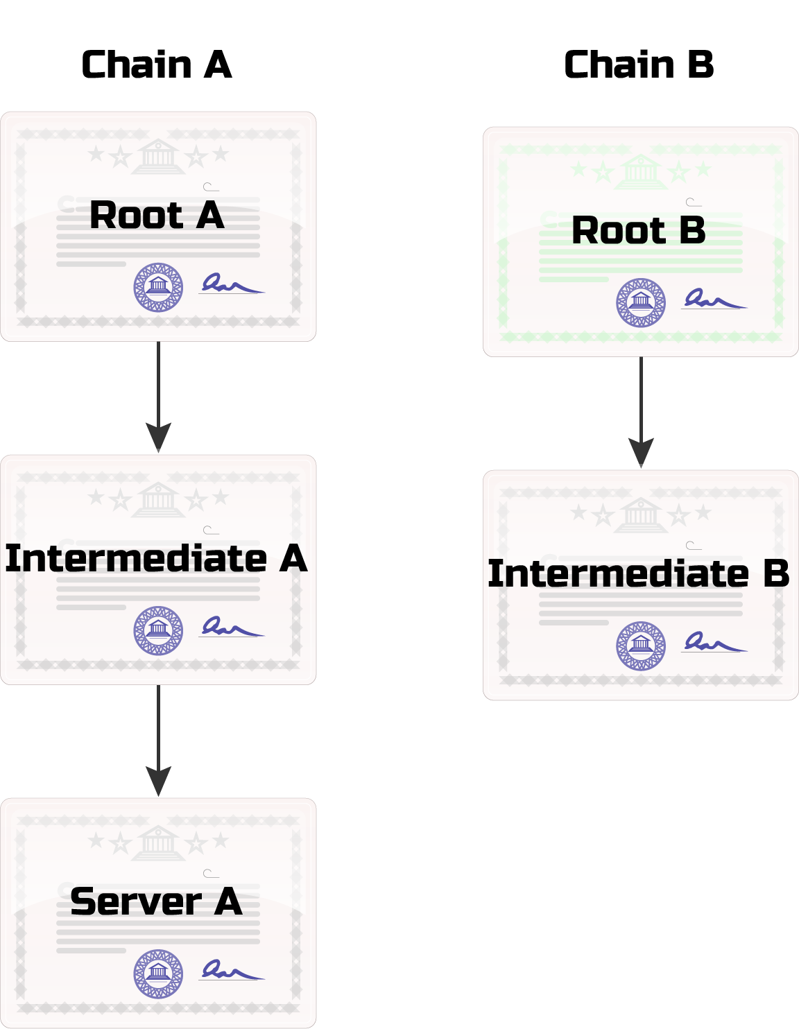 This PKI has two chains of trust: Chain A and Chain B. They are called chains because the signatures link the certificates together. Root A has signed Intermediate A's certificate and Intermediate A has signed Server A's certificate. Programmatically we can traverse these signatures and verify them using the public certificates of each signatory. Trusting Root A will trust Server A.