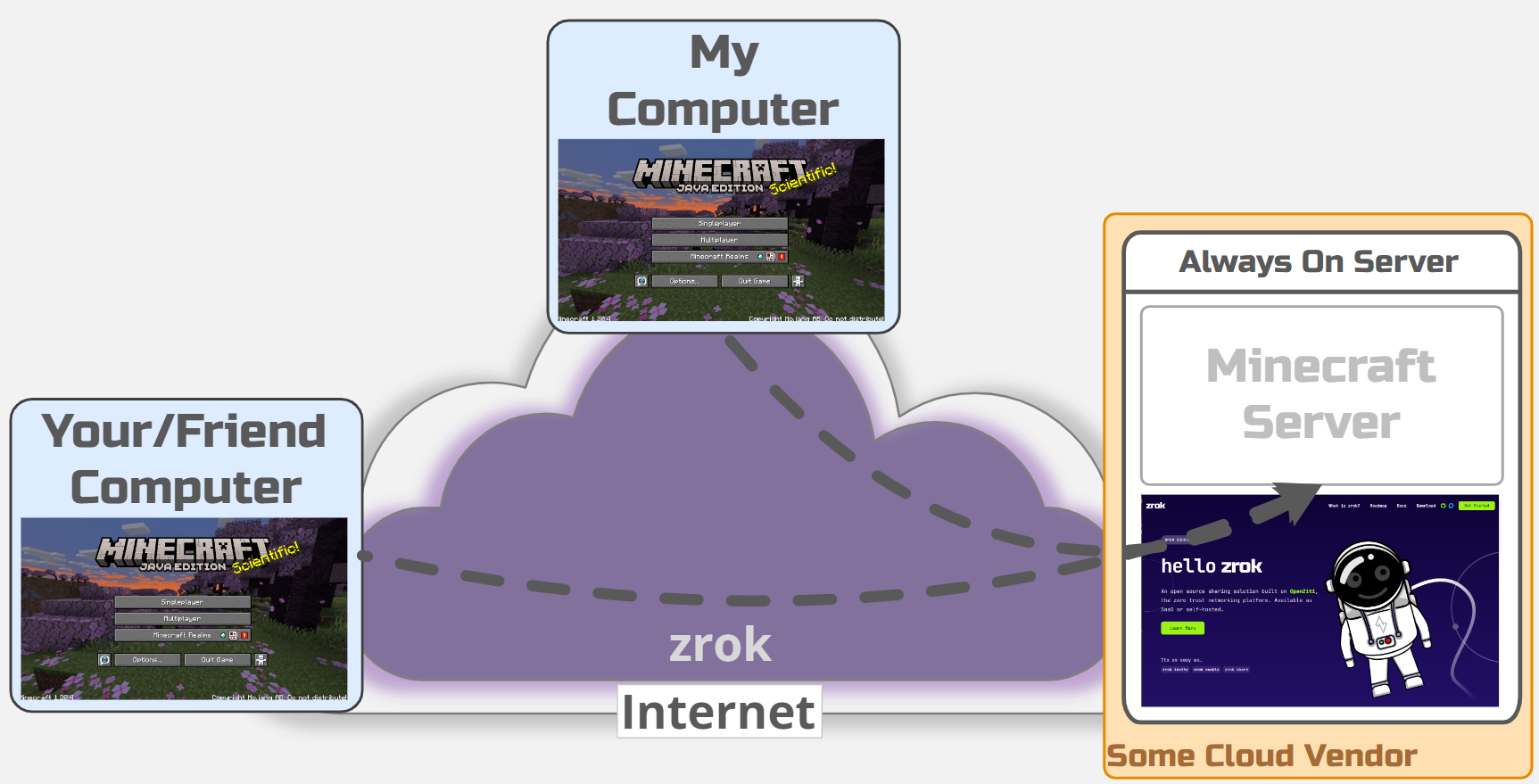 You want to play some Minecraft with our friends but our friends over the intenet, but you don't want to expose your Minecraft server to the world because that's just not a good idea! You can run the server in your house or, as shown below, on some other server you have, and you want our friends to be able to connect and play in the same world! That looks like this:
