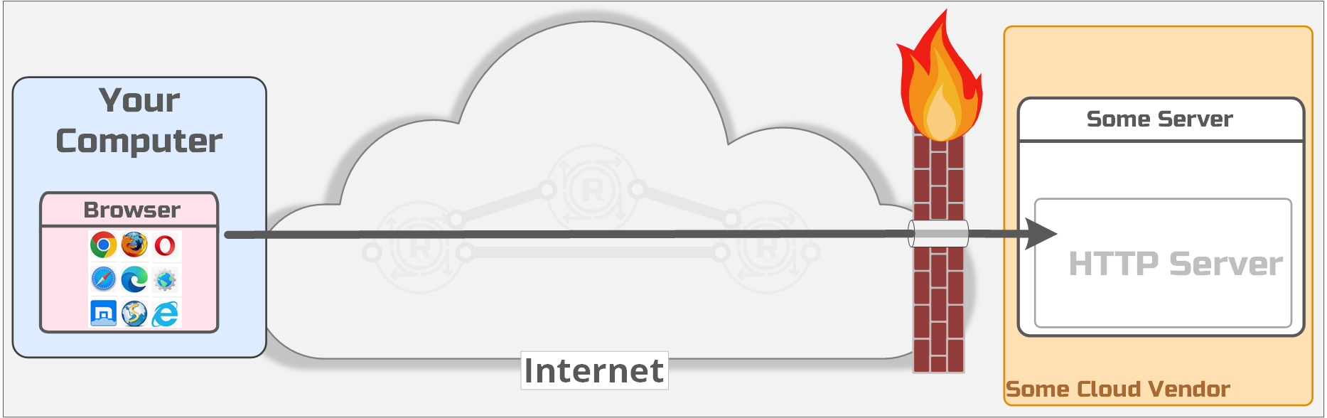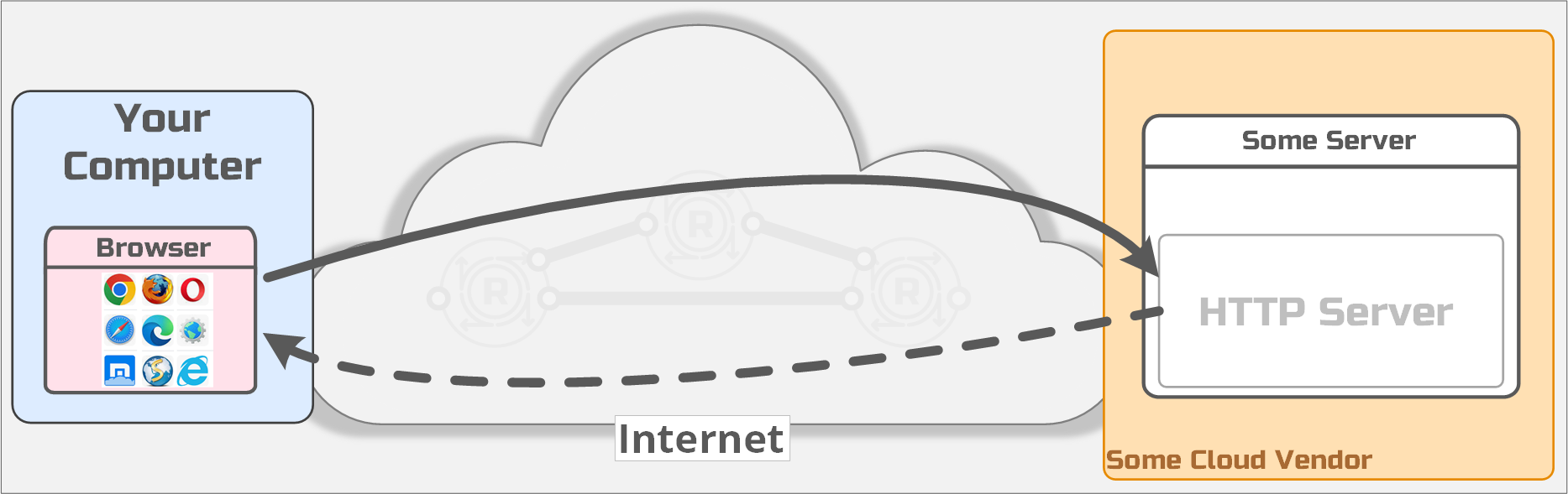 Your browser opened a connection to a server "listening" somewhere on the open internet. You've seen diagrams like this a million times, it looks something like this:
