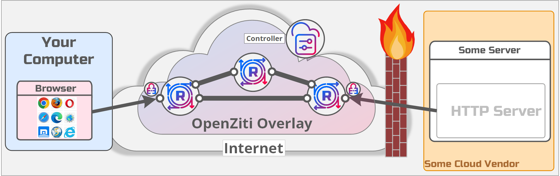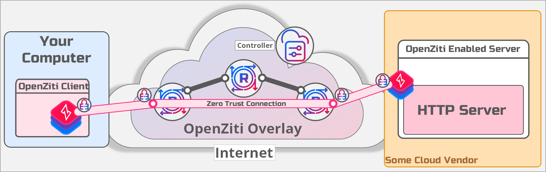 you leverage an OpenZiti overlay network where the server and client both dial outbound and connect to the OpenZiti mesh, deployed on the internet.