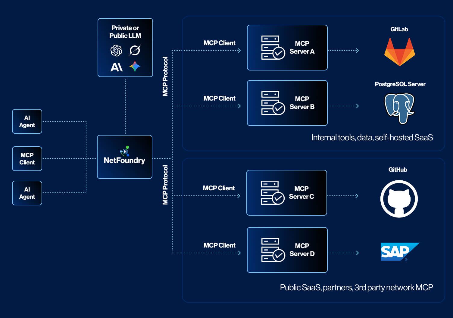 NetFoundry helps simplify and secure AI and MCP networking, with universal identity, visibility and controls. NetFoundry is used for secure connectivity for fine-tuning, RAG and inference. For model builders, it can be used for pretraining as well.